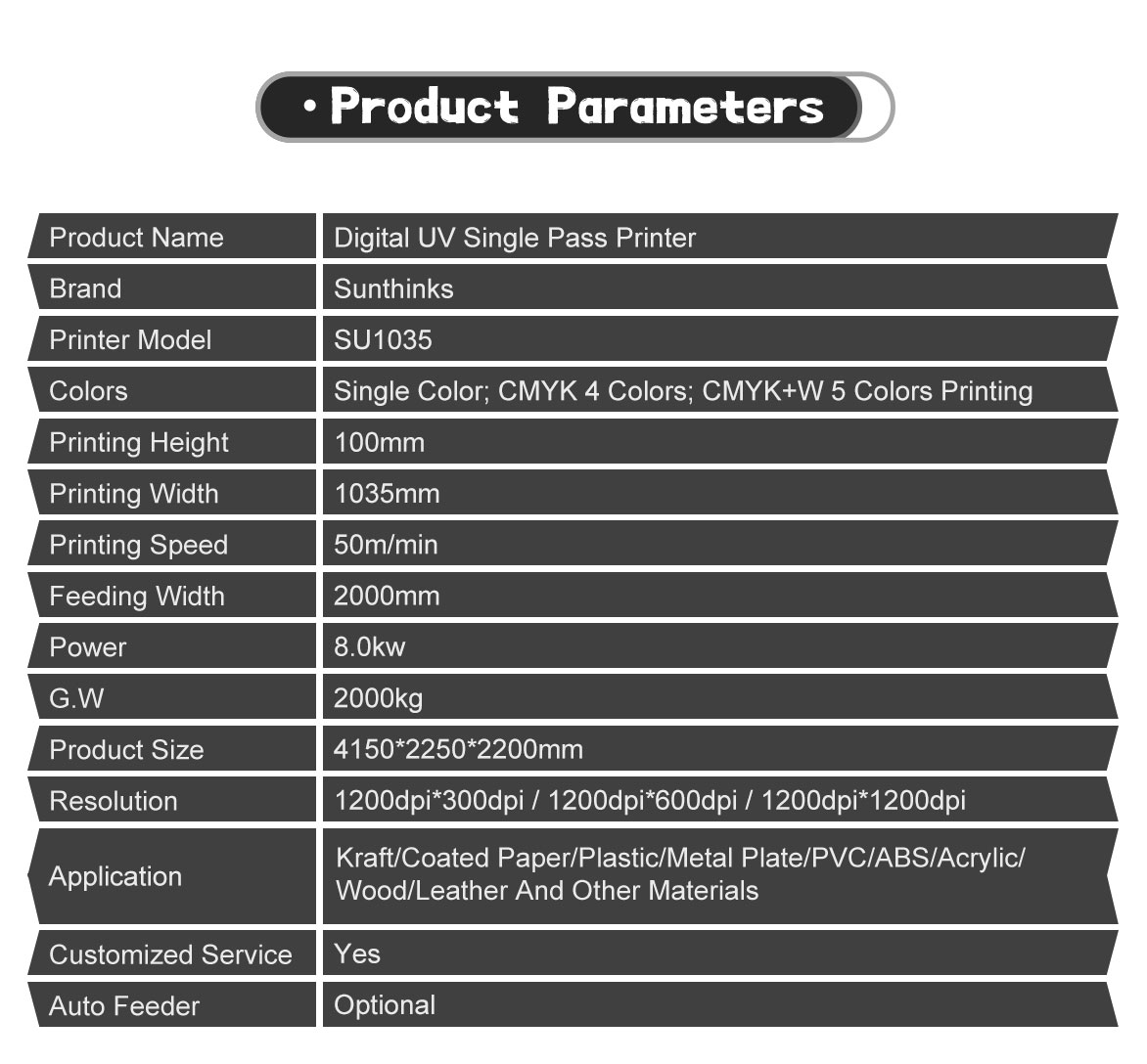 The Sunthinks SU1035 single pass uv printer is an ideal large sized, high speed, single pass uv printing machine, supporting monochrome, 4-color CMYK, or 5-color CMYK+W printing. It's suitable for batch printing and personalized customization across a wide range of industries, including high-end gift packaging, plastic packaging, plastic corrugated paper, coated paper, indoor/outdoor billboards, wood panels, file folders, notebook covers, metal packaging, leather, and various corporate/event promotional gifts.